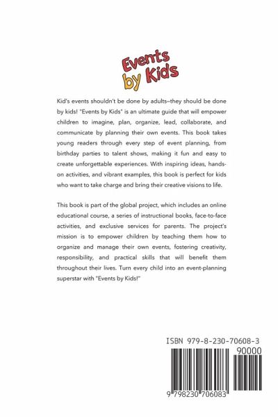 Kid's events shouldn't be done by adults-they should be done by kids! "Events by Kids" is an ultimate guide that will empower children to imagine, plan, organize, lead, collaborate, and communicate by planning their own events. This book takes young readers through every step of event planning, from birthday parties to talent shows, making it fun and easy to create unforgettable experiences. With inspiring ideas, hands-on activities, and vibrant examples, this book is perfect for kids who want to take charge and bring their creative visions to life. This book is part of the global project, which includes an online educational course, a series of instructional books, face-to-face activities, and exclusive services for parents. The project's mission is to empower children by teaching them how to organize and manage their own events, fostering creativity, responsibility, and practical skills that will benefit them throughout their lives. Turn every child into an event-planning superstar with "Events by Kids!"