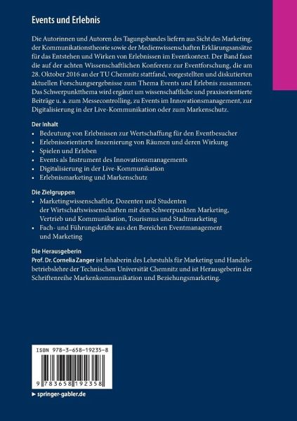 Die Autorinnen und Autoren des Tagungsbandes liefern aus Sicht des Marketing, der Kommunikationstheorie sowie der Medienwissenschaften Erklärungsansätze für das Entstehen und Wirken von Erlebnissen im Eventkontext. Der Band fasst die auf der achten Wissenschaftlichen Konferenz zur Eventforschung, die am 28. Oktober 2016 an der TU Chemnitz stattfand, vorgestellten und diskutierten aktuellen Forschungsergebnisse zum Thema Events und Erlebnis zusammen. Das Schwerpunktthema wird ergänzt um wissenschaftliche und praxisorientierte Beiträge u. a. zum Messecontrolling, zu Events im Innovationsmanagement, zur Digitalisierung in der Live-Kommunikation oder zum Markenschutz.