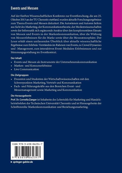 Auf der fünften Wissenschaftlichen Konferenz zur Eventforschung, die am 25. Oktober 2013 an der TU Chemnitz stattfand, wurden aktuelle Forschungsergebnisse zum Thema Events und Messen diskutiert. Die Autorinnen und Autoren liefern aus Sicht des Marketing, der Kommunikationstheorie, der Medienwissenschaften sowie der Informatik sich ergänzende Ansätze über den komplementären Einsatz von Messen und Events in der Markenkommunikation, über die Wirkung von Messeerlebnissen für die Marke sowie über die Messeatmosphäre. Der Leser erhält einen umfassenden Überblick über aktuelle wissenschaftliche Ergebnisse zum Erlebnis-Verständnis im Rahmen von Events, zu Crowd Dynamics und -Management, zum interaktiven Event-Medialen-Erlebnisraum und zur Stimmungsgestaltung im Eventkontext.