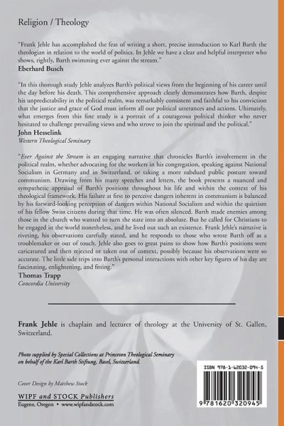 Endorsements: "Frank Jehle has accomplished the feat of writing a short, precise introduction to Karl Barth the theologian in relation to the world of politics. In Jehle we have a clear and helpful interpreter who shows, rightly, Barth swimming ever against the stream." Eberhard Busch "In this thorough study Jehle analyzes Barth's political views from the beginning of his career until the day before his death. This comprehensive approach clearly demonstrates how Barth, despite his unpredictability in the political realm, was remarkably consistent and faithful to his conviction that the justice and grace of God must inform all our political utterances and actions. Ultimately, what emerges from this fine study is a portrait of a courageous political thinker who never hesitated to challenge prevailing views and who strove to join the spiritual and the political." John Hesselink Western Theological Seminary "Ever against the Stream is an engaging narrative that chronicles Barth's involvement in the political realm, whether advocating for the workers in his congregation, speaking against National Socialism in Germany and in Switzerland, or taking a more subdued public posture toward communism. Drawing from his many speeches and letters, the book presents a nuanced and sympathetic appraisal of Barth's positions throughout his life and within the context of his theological framework. His failure at first to perceive dangers inherent in communism is balanced by his forward-looking perception of dangers within National Socialism and within the quietism of his fellow Swiss citizens during that time. He was often silenced. Barth made enemies among those in the church who wanted to turn the state into an absolute. But he called for Christians to be engaged in the world nonetheless, and he lived out such an existence. Frank Jehle's narrative is riveting, his observations carefully stated, and he responds to those who wrote Barth off as a troublemaker or out of touch. Jehle also goes to great pains to show how Barth's positions were caricatured and then rejected or taken out of context, possibly because his observations were so accurate. The little side trips into Barth's personal interactions with other key figures of his day are fascinating, enlightening, and fitting." Thomas Trapp Concordia University About the Contributor(s): Frank Jehle is chaplain and lecturer of theology at the University of St. Gallen, Switzerland.