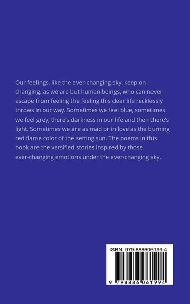 Our feelings, like the ever-changing sky, keep on changing, as we are but human beings, who can never escape from feeling the feeling this dear life recklessly throws in our way. Sometimes we feel blue, sometimes we feel grey, there’s darkness in our life and then there’s light. Sometimes we are as mad or in love as the burning red flame color of the setting sun. The poems in this book are the versified stories inspired by those ever-changing emotions under the ever-changing sky.