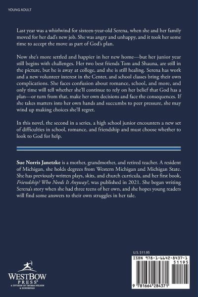 Last year was a whirlwind for sixteen-year-old Serena, when she and her family moved for her dad's new job. She was angry and unhappy, and it took her some time to accept the move as part of God's plan. Now she's more settled and happier in her new home-but her junior year still begins with challenges. Her two best friends Tom and Shauna, are still in the picture, but he is away at college, and she is still healing. Serena has work and a new volunteer interest in the Center, and school classes bring their own complications. She faces confusion about romance, school, and more, and only time will tell whether she'll continue to rely on her belief that God has a plan-or turn from that, make her own decisions and face the consequences. If she takes matters into her own hands and succumbs to peer pressure, she may wind up making choices she'll regret. In this novel, the second in a series, a high school junior encounters a new set of difficulties in school, romance, and friendship and must choose whether to look to God for help.