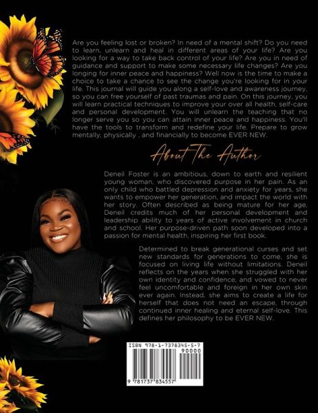 This mental health journal is designed to be your trusted companion on your healing and personal development journey. Within its pages, you'll find a nurturing space to explore and express your thoughts while fostering a deeper understanding of yourself. Through guided prompts and exercises, it gently encourages reflection and mindfulness, empowering you to find the root cause of your problems and tackle them head on to free yourself and find inner peace. As you work through this journal, each section will guide you to explore different aspects of your mental, physical and financial health. You will learn and unlearn practices to help you become the best version of yourself. Upon completion, you will be fully equipped to live an EVER NEW life.