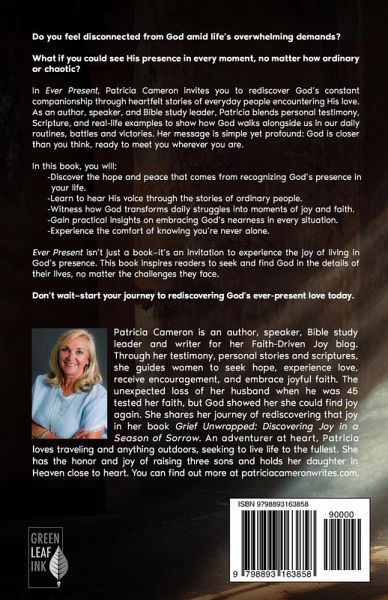 Do you feel disconnected from God amid life's overwhelming demands? What if you could see His presence in every moment, no matter how ordinary or chaotic? In Ever Present, Patricia Cameron invites you to rediscover God's constant companionship through heartfelt stories of everyday people encountering His love. As an author, speaker, and Bible study leader, Patricia blends personal testimony, Scripture, and real-life examples to show how God walks alongside us in our daily routines, battles and victories. Her message is simple yet profound: God is closer than you think, ready to meet you wherever you are. In this book, you will: * Discover the hope and peace that comes from recognizing God's presence in your life. * Learn to hear His voice through the stories of ordinary people. * Witness how God transforms daily struggles into moments of joy and faith. * Gain practical insights on embracing God's nearness in every situation. * Experience the comfort of knowing you're never alone. Ever Present isn't just a book-it's an invitation to experience the joy of living in God's presence. This book inspires readers to seek and find God in the details of their lives, no matter the challenges they face. Don't wait-start your journey to rediscovering God's ever-present love today.
