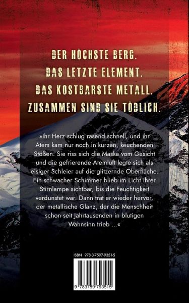 Über 8000 Meter gibt es keinen Platz für Moral. MOUNT EVEREST im Winter: Eisige Winde peitschen über den Berg, die Temperaturen liegen unter minus zwanzig Grad, Lawinen sind eine ständige Bedrohung, in Gletscherspalten lauert der Tod. Die Extrembergsteigerin Gilda Hunt weiß, dass sie auch unter diesen Bedingungen ein zweites Mal den höchsten Berg der Welt besteigen muss. Denn Big E hütet einen Schatz, der sie zu einer sehr reichen Frau machen könnte. Ihrem Team schließen sich zwei verfeindete Wissenschaftler an, die in einem erbitterten Konkurrenzkampf stehen. Wer das mysteriöse Element 126 zuerst entdeckt, bekommt den Nobelpreis. Und im Hintergrund der Expedition sind skrupellose Drahtzieher aktiv, die über Leichen gehen. In der Todeszone auf über 8000 Metern treffen alle aufeinander Für Fans von: Survival-Thrillern in extremer Umgebung Wissenschafts-Thrillern über spektakuläre Entdeckungen Bergsteiger-Abenteuern voller Gefahren und mörderischer Konkurren Jetzt lesen und das letzte Geheimnis des Everest enthüllen!