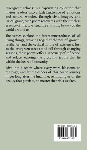 "Evergreen Echoes" is a captivating collection that invites readers into a lush landscape of emotions and natural wonder. Through vivid imagery and lyrical grace, each poem resonates with the timeless essence of life, love, and the enduring beauty of the world around us. The verses explore the interconnectedness of all living things, weaving together themes of growth, resilience, and the cyclical nature of existence. Just as the evergreen trees stand tall through changing seasons, these poems offer a sanctuary of reflection and solace, echoing the profound truths that lie within the heart of humanity. Dive into a realm where every word blossoms on the page, and let the echoes of this poetic journey linger long after the final line, reminding us of the beauty that persists, no matter the trials we face.
