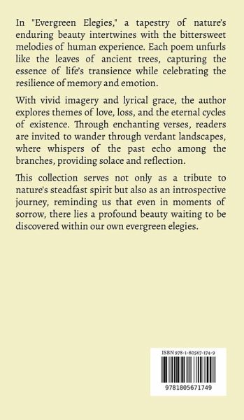 In "Evergreen Elegies," a tapestry of nature's enduring beauty intertwines with the bittersweet melodies of human experience. Each poem unfurls like the leaves of ancient trees, capturing the essence of life's transience while celebrating the resilience of memory and emotion. With vivid imagery and lyrical grace, the author explores themes of love, loss, and the eternal cycles of existence. Through enchanting verses, readers are invited to wander through verdant landscapes, where whispers of the past echo among the branches, providing solace and reflection. This collection serves not only as a tribute to nature's steadfast spirit but also as an introspective journey, reminding us that even in moments of sorrow, there lies a profound beauty waiting to be discovered within our own evergreen elegies.