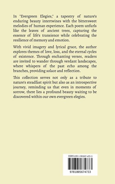 In "Evergreen Elegies," a tapestry of nature's enduring beauty intertwines with the bittersweet melodies of human experience. Each poem unfurls like the leaves of ancient trees, capturing the essence of life's transience while celebrating the resilience of memory and emotion. With vivid imagery and lyrical grace, the author explores themes of love, loss, and the eternal cycles of existence. Through enchanting verses, readers are invited to wander through verdant landscapes, where whispers of the past echo among the branches, providing solace and reflection. This collection serves not only as a tribute to nature's steadfast spirit but also as an introspective journey, reminding us that even in moments of sorrow, there lies a profound beauty waiting to be discovered within our own evergreen elegies.