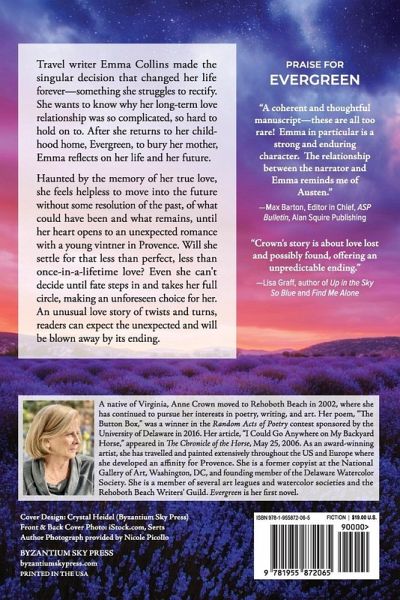 First Place Winner of Best Novel in the Delaware Press Association Professional Communications Contest 2023! Finalist in the 2024 Next Generation Indie Book Awards for First Novel (70,000 to 90,000 words)! Travel writer Emma Collins made the singular decision that changed her life forever-something she struggles to rectify. She wants to know why her long-term love relationship was so complicated, so hard to hold on to. After she returns to her childhood home, Evergreen, to bury her mother, Emma reflects on her life and her future. Haunted by the memory of her true love, she feels helpless to move into the future without some resolution of the past, of what could have been and what remains, until her heart opens to an unexpected romance with a young vintner in Provence. Will she settle for that less than perfect, less than once-in-a-lifetime love? Even she can't decide until fate steps in and takes her full circle, making an unforeseen choice for her. An unusual love story of twists and turns, readers can expect the unexpected and will be blown away by its ending.