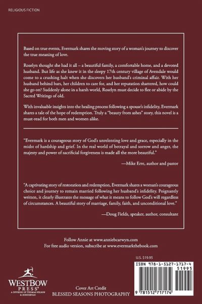 Based on true events, Evermark shares the moving story of a woman's journey to discover the true meaning of love. Roselyn thought she had it all - a beautiful family, a comfortable home, and a devoted husband. But life as she knew it in the sleepy 17th century village of Avendale would come to a crushing halt when she discovers her husband's criminal affair. With her husband behind bars, her children to care for, and her reputation shattered, how could she go on? Suddenly alone in a harsh world, Roselyn must decide to flee or abide by the Sacred Writings of old. With invaluable insights into the healing process following a spouse's infidelity, Evermark shares a tale of the hope of redemption. Truly a "beauty from ashes" story, this novel is a must-read for both men and women alike. "Evermark is a courageous story of God's unrelenting love and grace, especially in the midst of hardship and grief. In the real world of betrayal and sorrow and anger, the majesty and power of sacrificial forgiveness is made all the more beautiful." -Mike Erre, author and pastor "A captivating story of restoration and redemption, Evermark shares a woman's courageous choice and journey to remain married following her husband's infidelity. Poignantly written, it clearly illustrates the message of what it means to follow God's will regardless of circumstances. A beautiful story of marriage, family, faith, and unconditional love." -Doug Fields, speaker, author, consultant