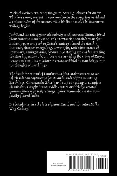 As the "Evermore Trilogy" begins, Jack Rand is a thirty-year-old nobody until he meets Unim, a biped plant from the planet Zeta6. It's a textbook alien abduction that suddenly goes awry when Unim's mutiny aboard the starship, Luminer, changes everything. Overnight, Jack's hometown of Evermore, Pennsylvania, becomes the staging ground for retaking the starship, a scientific craft commissioned by the rulers of Zaroz, Zeta6 and Hool. Its mission: to create artificial human beings from the thoughts of Earthlings. The battle for control of Luminer is a high-stakes contest to see which side can capture the hearts and minds of five unwitting Earthlings. Commander Zhorin will stop at nothing to complete his mission. Caught in the middle are two artificially-created human sisters who seek revenge against those who are responsible for creating their fatally-flawed bodies. In the balance, lies the fate of planet Earth and the entire Milky Way Galaxy. Copyright (c) 2002. 1st Ed. 11-23-04.