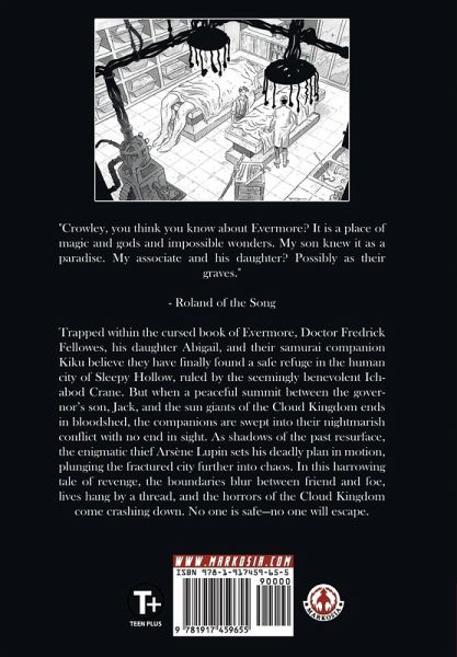 "Crowley, you think you know about Evermore? It is a place of magic and gods and impossible wonders. My son knew it as a paradise. My associate and his daughter? Possibly as their graves." - Roland of the Song Trapped within the cursed book of Evermore, Doctor Fredrick Fellowes, his daughter Abigail, and their samurai companion Kiku believe they have finally found a safe refuge in the human city of Sleepy Hollow, ruled by the seemingly benevolent Ichabod Crane. But when a peaceful summit between the governor's son, Jack, and the sun giants of the Cloud Kingdom ends in bloodshed, the companions are swept into their nightmarish conflict with no end in sight. As shadows of the past resurface, the enigmatic thief Arsène Lupin sets his deadly plan in motion, plunging the fractured city further into chaos. In this harrowing tale of revenge, the boundaries blur between friend and foe, lives hang by a thread, and the horrors of the Cloud Kingdom come crashing down. No one is safe-no one will escape.