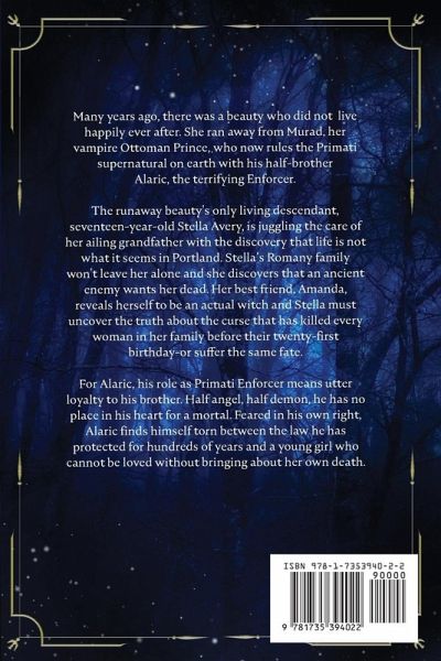 Centuries ago, there was a beauty who did not live happily ever after. She fled her vampire Ottoman Prince, who now rules the Primati supernatural on earth with his half-brother Alaric, the terrifying Enforcer. The runaway beauty's only living descendant, seventeen-year-old Stella Avery, is juggling the care of her ailing grandfather with the discovery that life is not what it seems in Portland, Oregon. Stella's Romany family shadow her every move and she discovers that an ancient enemy wants her dead. Her best friend, Amanda, reveals herself to be an actual witch and Stella must uncover the truth about the curse that has killed every woman in her family before their twenty- first birthday-or suffer the same fate. For Alaric, his role as Primati Enforcer means utter loyalty to his brother. Half-angel, half-demon, he has no place in his heart for a mortal. Feared in his own right, Alaric finds himself torn between the law he has protected for hundreds of years and a young girl who cannot be loved without bringing about her own death. "A page turning, unique re-imagined tale of Sleeping Beauty for those who crave a terrific, witchy urban fantasy." - Arc reviewer