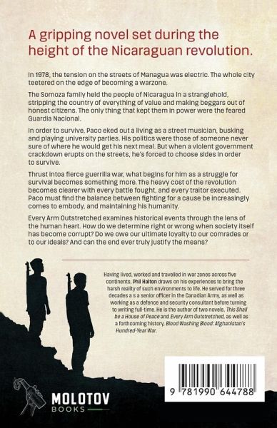 In 1978, the tension on the streets of Managua was electric. The whole city teetered on the edge of becoming a warzone. The Somoza family held the people of Nicaragua in a stranglehold, stripping the country of everything of value and making beggars out of honest citizens. The only thing that kept them in power was the feared Guardia Nacional. In order to survive, Paco eked out a living as a street musician, busking and playing university parties. His politics were those of someone never sure of where he would get his next meal. But when a violent government crackdown erupts on the streets, he's forced to choose sides in order to survive. Thrust into a fierce guerrilla war, what begins for him as a struggle for survival becomes something more. The heavy cost of the revolution becomes clearer with every battle fought, and every traitor executed. Paco must find the balance between fighting for a cause he increasingly comes to embody, and maintaining his humanity. Every Arm Outstretched examines historical events through the lens of the human heart. How do we determine right and wrong when society itself has become corrupt? Do we owe our ultimate loyalty to our comrades or to our ideals? And can the end ever truly justify the means?