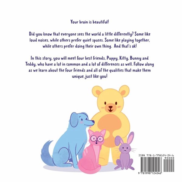 Your brain is beautiful! Did you know that everyone sees the world a little differently? Some like loud noises, while others prefer quiet spaces. Some like playing together, while others prefer doing their own thing. And that's ok! In this story, you will meet four best friends, Puppy, Kitty, Bunny and Teddy, who have a lot in common and a lot of differences as well. Follow along as we learn about the four friends and all of the qualities that make them unique, just like you! This book is designed to teach the concept of Neurodiversity in a way that is accessible to young children and inclusive to everyone.