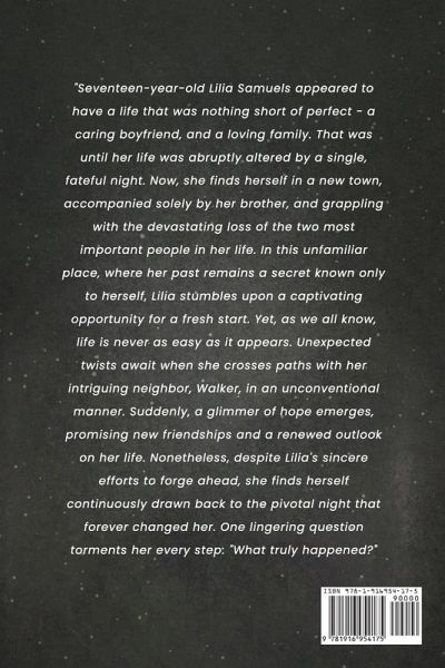 "Seventeen-year-old Lilia Samuels appeared to have a life that was nothing short of perfect - a caring boyfriend, and a loving family. That was until her life was abruptly altered by a single fateful night. Now, she finds herself in a new town, accompanied solely by her brother, and grappling with the devastating loss of the two most important people in her life. In this unfamiliar place, where her past remains a secret known only to herself, Lilia stumbles upon a captivating opportunity for a fresh start. Yet, as we all know, life is never as easy as it appears. Unexpected twists await when she crosses paths with her. intriguing neighbor, Walker, in an unconventional manner. Suddenly, a glimmer of hope emerges, . promising new friendships and a renewed outlook on her life. Nonetheless, despite Lilia's sincere efforts to forge ahead, she finds herself continuously drawn back to the pivotal night that forever changed her. One lingering question torments her every step: "What truly happened?"