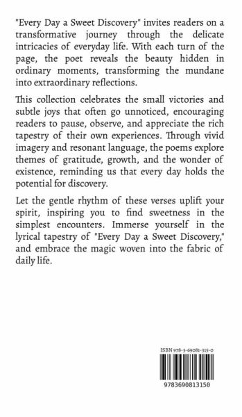 "Every Day a Sweet Discovery" invites readers on a transformative journey through the delicate intricacies of everyday life. With each turn of the page, the poet reveals the beauty hidden in ordinary moments, transforming the mundane into extraordinary reflections. This collection celebrates the small victories and subtle joys that often go unnoticed, encouraging readers to pause, observe, and appreciate the rich tapestry of their own experiences. Through vivid imagery and resonant language, the poems explore themes of gratitude, growth, and the wonder of existence, reminding us that every day holds the potential for discovery. Let the gentle rhythm of these verses uplift your spirit, inspiring you to find sweetness in the simplest encounters. Immerse yourself in the lyrical tapestry of "Every Day a Sweet Discovery," and embrace the magic woven into the fabric of daily life.