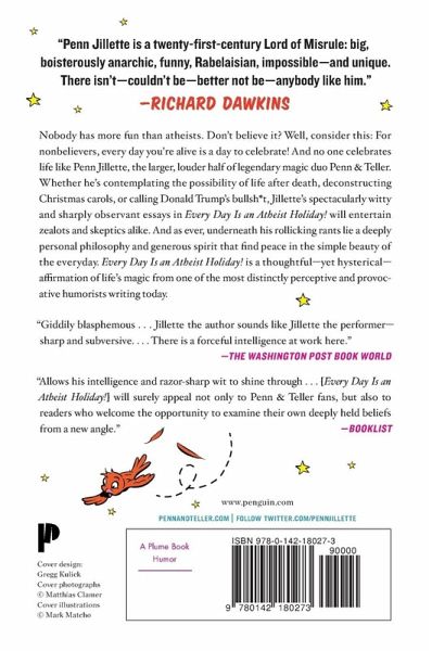 From Emmy Award-winning, world-famous magician Penn Jillette comes an irreverent, hilarious, and provocative book of essays-the perfect gift for the skeptic in your life. Let's be honest-nobody has more fun than atheists. Don't believe it? Well, consider this: For non-believers, every day you're alive is a day to celebrate! And no one celebrates life to the fullest like Penn Jillette, the larger, louder half of legendary magic duo Penn & Teller, whose spectacularly witty and sharply observant essays in Every Day Is an Atheist Holiday! will entertain zealots and skeptics alike. Whether he's contemplating the possibility of life after death, deconstructing popular Christmas carols, or just calling bullsh*t on Donald Trump, Jillette does not fail to shock and delight his readers. And as ever, underneath these rollicking rants lie a deeply personal philosophy and a generous spirit, which find joy and meaning in family, and peace in the simple beauty of the everyday. Every Day Is an Atheist Holiday! is a hysterical affirmation of life's magic from one of the most distinctly perceptive and provocative humorists writing today.