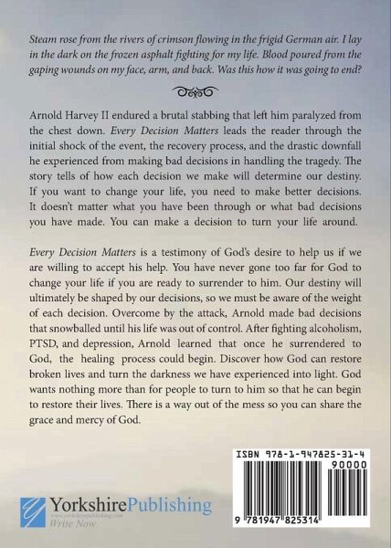 Arnold Harvey II endured a brutal stabbing that le him paralyzed from the chest down. Every Decision Matters leads the reader through the initial shock of the event, the recovery process, and the drastic downfall he experienced from making bad decisions in handling the tragedy. The story tells of how each decision we make will determine our destiny. If you want to change your life, you need to make better decisions. It doesn't matter what you have been through or what bad decisions you have made. You can make a decision to turn your life around. Every Decision Matters is a testimony of God's desire to help us if we are willing to accept his help. You have never gone too far for God to change your life if you are ready to surrender to him. Our destiny will ultimately be shaped by our decisions, so we must be aware of the weight of each decision. Overcome by the attack, Arnold made bad decisions that snowballed until his life was out of control. After fighting alcoholism, PTSD, and depression, Arnold learned that once he surrendered to God, the healing process could begin. Discover how God can restore broken lives and turn the darkness we have experienced into light. God wants nothing more than for people to turn to him so that he can begin to restore their lives. ere is a way out of the mess so you can share the grace and mercy of God.