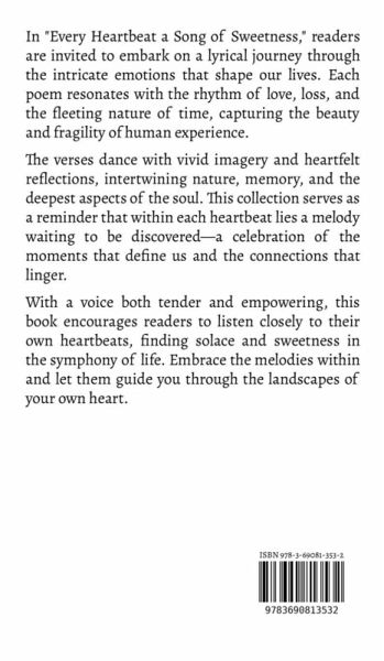 In "Every Heartbeat a Song of Sweetness," readers are invited to embark on a lyrical journey through the intricate emotions that shape our lives. Each poem resonates with the rhythm of love, loss, and the fleeting nature of time, capturing the beauty and fragility of human experience. The verses dance with vivid imagery and heartfelt reflections, intertwining nature, memory, and the deepest aspects of the soul. This collection serves as a reminder that within each heartbeat lies a melody waiting to be discovered-a celebration of the moments that define us and the connections that linger. With a voice both tender and empowering, this book encourages readers to listen closely to their own heartbeats, finding solace and sweetness in the symphony of life. Embrace the melodies within and let them guide you through the landscapes of your own heart.