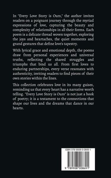In "Every Love Story is Ours," the author invites readers on a poignant journey through the myriad expressions of love, capturing the beauty and complexity of relationships in all their forms. Each poem is a delicate thread woven together, exploring the joys and heartaches, the quiet moments and grand gestures that define love's tapestry. With lyrical grace and emotional depth, the poems draw from personal experiences and universal truths, reflecting the shared struggles and triumphs that bind us all. From first loves to enduring partnerships, every verse resonates with authenticity, inviting readers to find pieces of their own stories within the lines. This collection celebrates love in its many guises, reminding us that every heart has a narrative worth telling. "Every Love Story is Ours" is not just a book of poetry; it is a testament to the connections that shape our lives and the dreams that dance in our hearts.