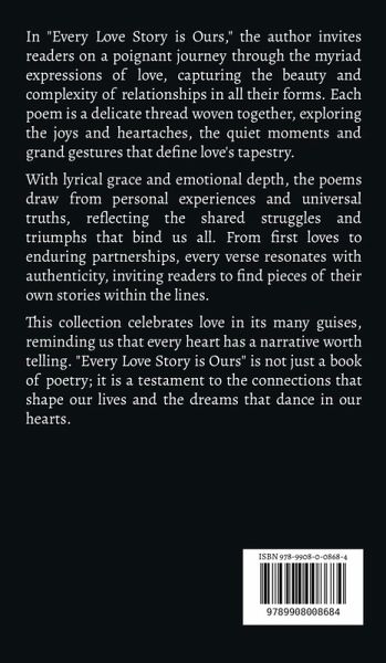 In "Every Love Story is Ours," the author invites readers on a poignant journey through the myriad expressions of love, capturing the beauty and complexity of relationships in all their forms. Each poem is a delicate thread woven together, exploring the joys and heartaches, the quiet moments and grand gestures that define love's tapestry. With lyrical grace and emotional depth, the poems draw from personal experiences and universal truths, reflecting the shared struggles and triumphs that bind us all. From first loves to enduring partnerships, every verse resonates with authenticity, inviting readers to find pieces of their own stories within the lines. This collection celebrates love in its many guises, reminding us that every heart has a narrative worth telling. "Every Love Story is Ours" is not just a book of poetry; it is a testament to the connections that shape our lives and the dreams that dance in our hearts.