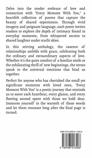 Delve into the tender embrace of love and connection with "Every Moment With You," a heartfelt collection of poems that capture the beauty of shared experiences. Through vivid imagery and poignant language, each poem invites readers to explore the depth of intimacy found in everyday moments, from whispered secrets to shared laughter under starlit skies. In this stirring anthology, the essence of relationships unfolds with grace, celebrating both the ordinary and extraordinary aspects of love. Whether it's the quiet comfort of a familiar smile or the exhilarating thrill of new beginnings, the verses speak to the universal emotions that bind us together. Perfect for anyone who has cherished the small yet significant moments with loved ones, "Every Moment With You" is a poetic journey that reminds us to savor each heartbeat, every glance, and every fleeting second spent with those we hold dear. Immerse yourself in the warmth of these words and let them resonate long after the final page is turned.