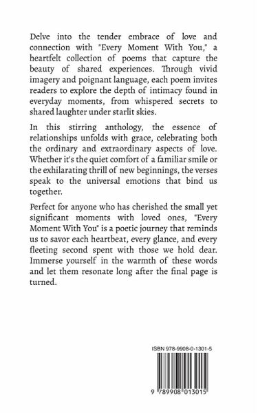 Delve into the tender embrace of love and connection with "Every Moment With You," a heartfelt collection of poems that capture the beauty of shared experiences. Through vivid imagery and poignant language, each poem invites readers to explore the depth of intimacy found in everyday moments, from whispered secrets to shared laughter under starlit skies. In this stirring anthology, the essence of relationships unfolds with grace, celebrating both the ordinary and extraordinary aspects of love. Whether it's the quiet comfort of a familiar smile or the exhilarating thrill of new beginnings, the verses speak to the universal emotions that bind us together. Perfect for anyone who has cherished the small yet significant moments with loved ones, "Every Moment With You" is a poetic journey that reminds us to savor each heartbeat, every glance, and every fleeting second spent with those we hold dear. Immerse yourself in the warmth of these words and let them resonate long after the final page is turned.