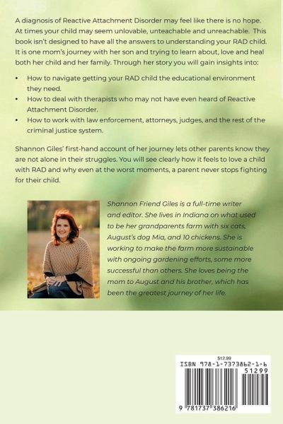 Parenting is challenging in the best of circumstances. Adopted and foster children with early childhood trauma require a level of parenting that often feels impossible to attain. A diagnosis of Reactive Attachment Disorder may feel like there is no hope. At times your child may seem unlovable, unteachable and unreachable. And creating a family with these damaged children so often feels like it will never happen. This book isn't designed to have all the answers to making a perfect family with your RAD child. It is one mom's journey with her son and trying to learn, love and heal both her child and her family. Through her story you will gain insights into:How to navigate through getting your RAD child the educational environment they need to be successful. How to deal with therapists who may not have even heard of reactive attachment disorder and be a champion for your child. And while it hopefully won't ever be necessary, how to work with law enforcement, attorneys, judges and the rest of the criminal justice system. Shannon Giles gives you a first-hand account of her life with a child with Reactive Attachment Disorder. To let other parents know they are not alone in the struggles and how she has advocated for her child for over 20 years. You will see clearly how it feels to love a child with RAD and why even at the worst moments, a parent never stops fighting for their child.