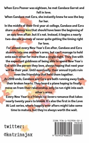 When Ezra Posner was eighteen, he met Candace Garret and fell in love. When Candace met Ezra, she instantly knew he was the boy for her. In the middle of their first year at college, Candace and Ezra share a clumsy kiss that should have been the beginning of an epic love affair, but it's not. Instead, it begins a nearly two-decade journey of never quite getting the timing right for love. For almost every New Year's Eve after, Candace and Ezra stumble into one another's arms, but can't manage to hold onto each other for more than a single night. They live with the expectant giddiness of being able to spend New Year's Eve with the person they love, always hoping that next year will be their year. Until eventually, their annual trysts ruin even the friendship that held them together. As 2019 ends, Candace and Ezra are both running away from their broken hearts. They board a plane hoping to finally move on from their relationship, only to run right into each other's arms. Every New Year is a friends-to-lovers romance that takes nearly twenty years to bloom. It's also the first in the Love At Last series, where happily ever afters might take some time to mature, but they're always worth the wait. Content Warnings: parental sickness (cancer, diabetes, hypertension)¿