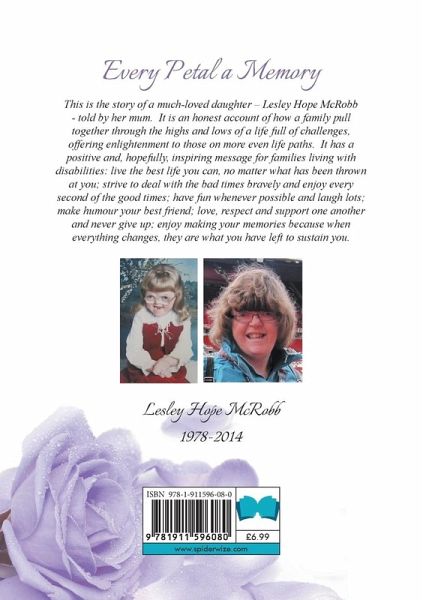 This is the story of a much-loved daughter - Lesley Hope McRobb - told by her mum. It is an honest account of how a family pull together through the highs and lows of a life full of challenges, offering enlightenment to those on more even life paths. It has a positive and, hopefully, inspiring message for families living with disabilities: live the best life you can, no matter what has been thrown at you; strive to deal with the bad times bravely and enjoy every second of the good times; have fun whenever possible and laugh lots; make humour your best friend; love, respect and support one another and never give up; enjoy making your memories because when everything changes, they are what you have left to sustain you.