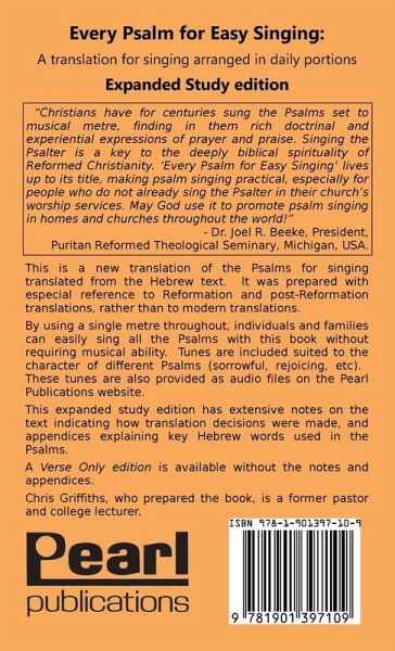 Every Psalm for Easy Singing. Expanded Study Edition "Christians have for centuries sung the Psalms set to musical meter, finding in them rich doctrinal and experiential expressions of prayer and praise. Singing the Psalter is a key to the deeply biblical spirituality of Reformed Christianity. Every Psalm for Easy Singing lives up to its title, making psalm singing practical, especially for people who do not already sing the Psalter in their church's worship services. May God use it to promote psalm singing in homes and churches throughout the world!"--Dr. Joel R. Beeke, President, Puritan Reformed Theological Seminary, Grand Rapids, MichiganThis book is a new translation of all the Psalms in verse for singing arranged in 365 daily portions with textual and expository notes on the translation.# It uses the same metre throughout for 'easy singing'. 12 tunes are suggested and provided, together with audio files on the Pearl Publications website.# It translates from the Hebrew relying heavily on the older versions, notably the King James Version, the Dutch Bible (Statenvertaling) and its notes (1637), Calvin's translation (1557) and the Geneva Bible (1560).# It has an Appendix on key Hebrew words used in the Psalms, including the names of God, the words for 'man' and the 'law words' in the Psalms. # It has a full account of resources used in preparing the translation is given. 390 pages, 2,400 footnotes on the translation.# It enables anyone who leads group or family worship using the 'Help for using the Psalms in Personal and Family Worship' to be better prepared for the time of worship. # A 'Verse Only' edition is also available without the appendices and notes.