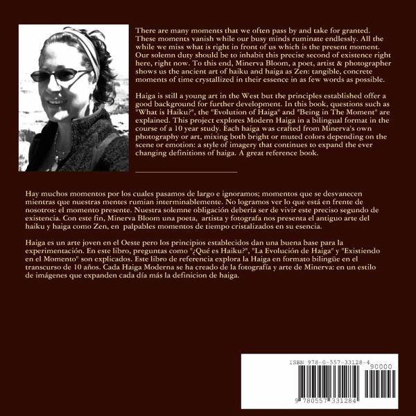 Full Color: LARGE SQUARE BOOK 8.5x8.5 - There are many moments that we often pass by and take for granted. Moments that vanish while our minds ruminate endlessly. All the while we miss what is right in front of us which is the present moment. To this end Minerva Bloom, a poet, artist & photographer, shows us the ancient art of haiga as Zen: tangible, concrete moments of time, crystallized in their essence in as few words as possible. In this book questions such as "What is Haiku?", "Evolution of Haiga" and "Being in The Moment" are explained. Modern Haiga presented in a bilingual format in the course of a 10 year study mixing both bright or muted colors depending on the scene or emotion: a style of imagery that continues to expand the definitions of haiga. A Great Reference Book. (En este libro de referencia, preguntas como "¿Qué es Haiku?", "La Evolución de Haiga" y "Existiendo en el Momento" son explicados en formato bilingüe con fotografía y arte de Minerva Bloom).