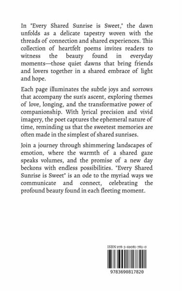 In "Every Shared Sunrise is Sweet," the dawn unfolds as a delicate tapestry woven with the threads of connection and shared experiences. This collection of heartfelt poems invites readers to witness the beauty found in everyday moments-those quiet dawns that bring friends and lovers together in a shared embrace of light and hope. Each page illuminates the subtle joys and sorrows that accompany the sun's ascent, exploring themes of love, longing, and the transformative power of companionship. With lyrical precision and vivid imagery, the poet captures the ephemeral nature of time, reminding us that the sweetest memories are often made in the simplest of shared sunrises. Join a journey through shimmering landscapes of emotion, where the warmth of a shared gaze speaks volumes, and the promise of a new day beckons with endless possibilities. "Every Shared Sunrise is Sweet" is an ode to the myriad ways we communicate and connect, celebrating the profound beauty found in each fleeting moment.