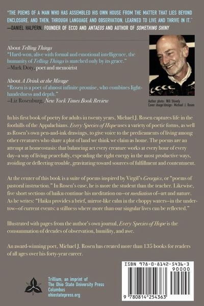 In his first book of poetry in twenty years, Michael J. Rosen captures life in the foothills of the Appalachians. Every Species of Hope: Georgics, Haiku, and Other Poems uses a variety of poetic forms, as well as Rosen's own pen-and-ink drawings, to give voice to the predicaments of living among other creatures who share a plot of land we think we claim as home. The poems are an attempt at homeostasis: that balancing act every creature works at every hour of every day-a way of living peacefully, expending the right energy in the most productive ways, avoiding or deflecting trouble, gravitating toward sources of fulfillment and contentment. At the center of this book is a suite of poems inspired by Virgil's Georgics, or "poems of pastoral instruction." In Rosen's case, he is more the student than the teacher. Likewise, five short sections of haiku continue his meditation on-or mediation of-art and nature. As he has written, "Haiku provides a brief and mirror-like calm in the choppy waters-in the undertow-of current events: a stillness in time where more than our singular lives can be reflected." Illustrated with two dozen pages from the author's own journal, Every Species of Hope is the consummation of decades of observation, humility, and awe.