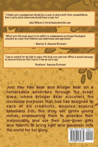Embark on a delightful journey through the heartwarming pages of "Every Tree Has Its Place," a beautifully illustrated Christian picture book tailored for young minds aged 4-8. Join Paw Paw Bear and Bridger Bear in The Great Wood as they explore the profound message of Ephesians 2:10, unfolding essential lessons for your child's spiritual growth. Key Highlights: Faith-Based Exploration: Immerse your child in a faith-filled adventure as Paw Paw Bear imparts the timeless wisdom of Ephesians 2:10. This captivating story serves as a gentle guide for young hearts to understand their unique purpose. Embracing Individuality: Follow Bridger Bear on a journey of self-discovery, teaching young readers the importance of embracing their distinct qualities. Every child is a masterpiece, intricately designed by God for a special purpose. Recognizing God-Given Gifts: Inspire your child to recognize the precious gifts bestowed upon them by God. Through engaging storytelling, children learn how to use these gifts to bring joy to others and contribute positively to the world. Understanding God's Plan: Explore the intricate plan God has for each individual, as conveyed through Ephesians 2:10. This story fosters a deep understanding that every child has a unique and valuable place in God's grand design. Finding Joy and Purpose: Ignite a sense of purpose in young hearts, encouraging them to discover the joy that comes from using their gifts. The narrative inspires children to shine their light, making a positive impact and glorifying God. "Every Tree Has Its Place" is more than a children's book; it's a purposeful journey designed for kids aged 4-8. Join Paw Paw Bear and Bridger Bear as they navigate The Great Wood, exploring the profound message found in Ephesians 2:10. In this engaging tale, young readers discover the importance of embracing their individuality and using their unique talents to make a positive impact. This book is a valuable addition to the categories of Faith-based Children's Books, Christian Storybooks for Kids, God-Centered Children's Literature, and Biblical Lessons for Kids. If you're looking for a meaningful narrative that not only captivates but also imparts essential life lessons, "Every Tree Has Its Place" is the perfect choice for your child. Order your copy today and let the exploration of faith, individuality, and purpose begin.