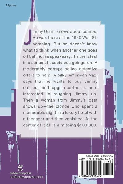 Jimmy Quinn knows about bombs. He was there at the 1920 Wall St. bombing. But he doesn’t know what to think when another one goes off behind his speakeasy. It’s the latest in a series of suspicious goings-on. A moderately corrupt police detective offers to help. A silky American Nazi says that he wants to buy Jimmy out, but his thuggish partner is more interested in roughing Jimmy up. Then a woman from Jimmy’s past shows up—the blonde who spent a memorable night in a luxury hotel with a teenager and then vanished. At the center of it all is a missing $100,000.