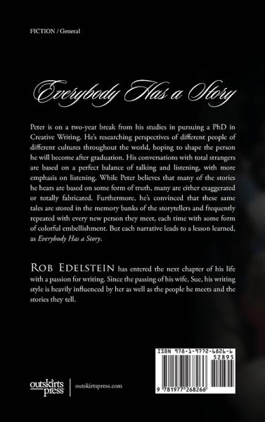 Peter is on a two-year break from his studies in pursuing a PhD in Creative Writing. He's researching perspectives of different people of different cultures throughout the world, hoping to shape the person he will become after graduation. His conversations with total strangers are based on a perfect balance of talking and listening, with more emphasis on listening. While Peter believes that many of the stories he hears are based on some form of truth, many are either exaggerated or totally fabricated. Furthermore, he's convinced that these same tales are stored in the memory banks of the storytellers and frequently repeated with every new person they meet, each time with some form of colorful embellishment. But each narrative leads to a lesson learned, as Everybody Has a Story.