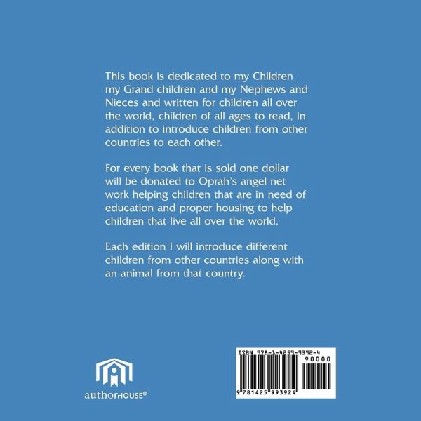 This book is dedicated to my Children my Grand children and my Nephews and Nieces and written for children all over the world, children of all ages to read, in addition to introduce children from other countries to each other. For every book that is sold one dollar will be donated to Oprah's angel net work helping children that are in need of education and proper housing to help children that live all over the world. Each edition I will introduce different children from other countries along with an animal from that country.
