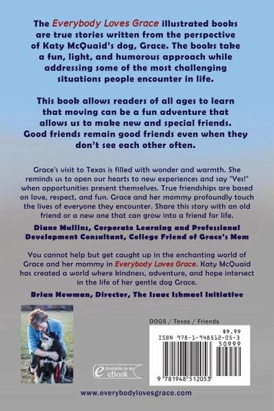 The Everybody Loves Grace illustrated books are true stories written from the perspective of Katy McQuaid's dog, Grace. The books take a fun, light and humorous approach while addressing some of the most challenging situations people encounter in life. This book allows readers of all ages to learn that moving can be a fun adventure that allows us to make new and special friends. Good friends remain good friends, even when they don't see each other often. Grace asks to go on a road trip, this time back to Texas. This adventure starts in San Antonio with a visit with long time friends. Grace…mehr