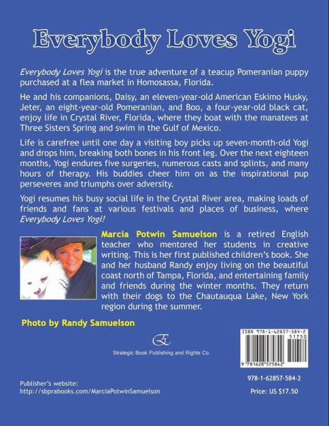 Everybody Loves Yogi is the true adventure of a teacup Pomeranian puppy purchased at a flea market in Homosassa, Florida. He and his companions, Daisy, an eleven-year-old American Eskimo Husky, Jeter, an eight-year-old Pomeranian, and Boo, a four-year-old black cat, enjoy life in Crystal River, Florida, where they boat with the manatees at Three Sisters Spring and swim in the Gulf of Mexico. Life is carefree until one day a visiting boy picks up seven-month-old Yogi and drops him, breaking both bones in his front leg. Over the next eighteen months, Yogi endures five surgeries, numerous casts and splints, and many hours of therapy. His buddies cheer him on as the inspirational pup perseveres and triumphs over adversity. Yogi resumes his busy social life in the Crystal River area, making loads of friends and fans at various festivals and places of business, where Everybody Loves Yogi! Marcia Potwin Samuelson is a retired English teacher who mentored her students in creative writing. This is her first published children's book. She and her husband Randy enjoy living on the beautiful coast north of Tampa, Florida, and entertaining family and friends during the winter months. They return with their dogs to the Chautauqua Lake, New York region during the summer. Publisher's website: http://sbprabooks.com/MarciaPotwinSamuelson