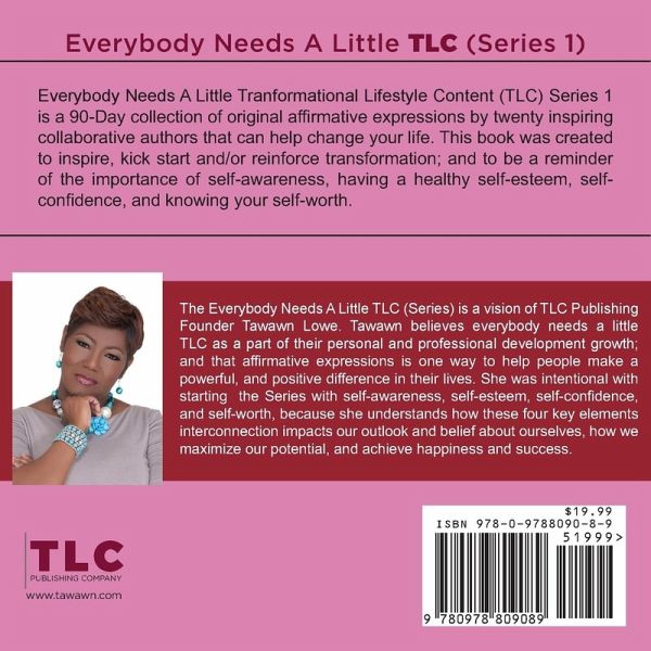 Everybody Needs A Little TLC Series books are a collection of transformational lifestyle content in the form of affirmative expressions that focus on personal development topics that contributes to intentional, mindful and purposeful living. The first Series of the collection is 90-Days of Self-Awareness, Self-Esteem, Self-Confidence, and Self-Worth. The goal of this book is to use affirmative expressions to help feed your mind positive thoughts, to shift your perspective where needed, and provide a method to help you foster the changes you want to see. In 90-days you have the ability to change your attitude, perspective and direction of your life. The book consists of 90 days of affirmative expressions and declarations that require a consistent ritual to take action to positively feed your mind.