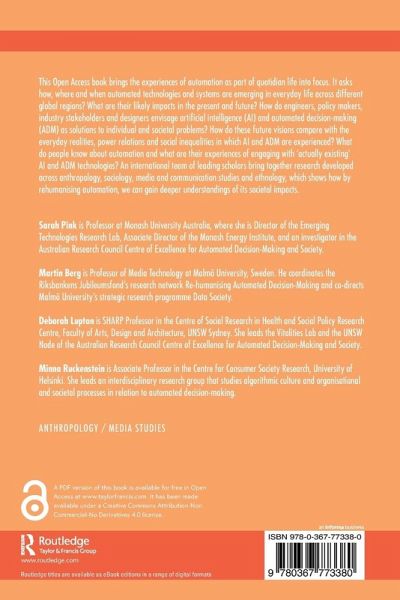 This Open Access book brings the experiences of automation as part of quotidian life into focus. It asks how, where and when automated technologies and systems are emerging in everyday life across different global regions? What are their likely impacts in the present and future? How do engineers, policy makers, industry stakeholders and designers envisage artificial intelligence (AI) and automated decision-making (ADM) as solutions to individual and societal problems? How do these future visions compare with the everyday realities, power relations and social inequalities in which AI and ADM are experienced? What do people know about automation and what are their experiences of engaging with 'actually existing' AI and ADM technologies? An international team of leading scholars bring together research developed across anthropology, sociology, media and communication studies and ethnology, which shows how by rehumanising automation, we can gain deeper understandings of its societal impacts.