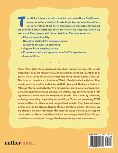 This children's book is an informative introduction to Black Deaf/disabled people, as well as a heartfelt tribute to our lives and experiences.There will be narratives about Black Deaf/disabled characters throughout the book.The book will introduce the reader to various disabilities and relate stories of Black people with these disabilities.The book seeks to: - Educate about disability. - Normalize disabled life and experiences. - Amplify Black disabled narratives. - Support Black disability culture. - Promote curiosity and appreciation of all life experiences. - Impact all lives.