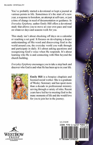 You've probably started a devotional or kept a journal at various points in life. Sometimes it's the start of a new year, a response to boredom, an attempt at self-care, or just a time of change in need of documentation or guidance. In Everyday Epiphany, author Emily Hill offers a devotional study that allows you to move at your own pace and read on whatever days and seasons work for you. This study isn't about checking off days on a calendar or reaching a set goal. It focuses on developing a deeper understanding of His word and discovering God in the world around you, the everyday world you walk through and participate in daily. It's about asking questions and recognizing God's voice when He responds. It's about learning who He is and connecting with Him beyond the church building. Everyday Epiphany encourages you to take a step back and discover who God is and what He has been up to in your life.
