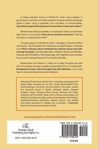 In these turbulent times of COVID-19, when many leaders in government, business, and other positions of power behave as though greed is good, lying is laudable, and corruption is commendable, should we expect ethical behavior from them or from each other? What are we willing to tolerate or not tolerate? Does our worldview align with our core values? How do we conduct ourselves? How do we view our creativity and worth? Through easy-to-understand poetic messages, Everyday Ethics and Equity: The Foundation for Character and Self-Esteem motivates us to think critically about contemporary ethical issues and self-valuing concepts. Like its predecessor, Dreams, Deeds, and Destiny: Purpose and Possibility in the Space Age, this insightful book is written from a cosmic perspective and a humanist worldview. Reasonable and relevant, it helps us to align thoughts and acts with core values and gain a greater appreciation for our innate worth. Designed to evoke critical thought and self-reflection, it is a must have in every individual home and institution. (About the Author) Gwendolyn Rose Forrest earned a B.A. (sociology/ psychology) from Wayne State University and an M.A. (public administration) from Central Michigan University. She has worked in the public, private, and non-profit sectors in Detroit, Michigan; Atlanta, Georgia; Portland, Oregon; Chicago, Illinois; Denver, Colorado; San Diego, California; and Fort Worth, Texas. She is a former social worker, civil rights/human rights advocate, economic development administrator, employment/training coordinator, research director, and certified fund-raising executive for colleges and universities. A Humanist, feminist, and activist, she resides in Detroit.