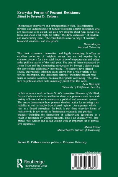 Peasant rebellions are uncommon. "Everyday Forms of Peasant Resistance" explores peasants' foot dragging, feigned ingorance, false compliance, manipulation, flight, slander, theft, arson, sabotage, and similar prosaic forms of struggle. These kinds of resistance stop well short of collective defiance, a strategy usually suicidal for the subordinate. The central argument about peasant resistance is presented in the opening chapter by James Scott in which he summarizes and extends the thesis of his book on Malaysia's peasantry, "Weapons of the Weak". Scott's ideas are employed and refined in the ensuing seven country studies of peasant resistance: Poland, India, Egypt, Colombia, China, Nicaragua and Zimbabwe.