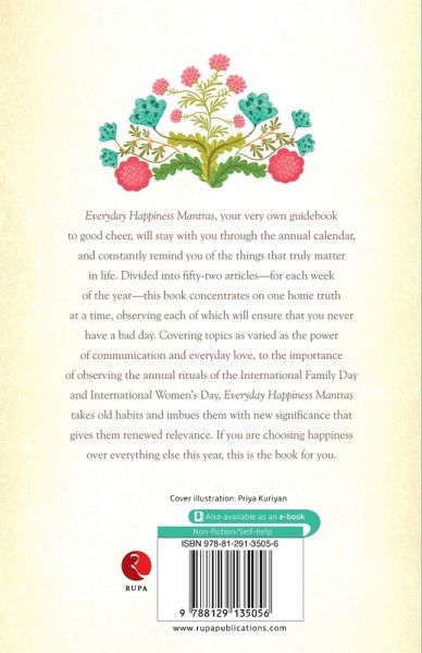 The most important person in your life should be you. The voice with which you speak to yourself should be kind, gentle and nurturing. Most of us treat ourselves like harsh jailors rather than gentle caregivers. Forgive yourself, encourage yourself. Everyday Happiness Mantras, your very own guidebook to good cheer, will stay with you through the annual calendar and constantly remind you of the things that truly matter in life. Divided into fifty-two articles for each week of the year this book concentrates on one home truth at a time, observing each of which will ensure that you never have a bad day. Covering topics as varied as the power of communication and everyday love, to the importance of observing the annual rituals of the International Family Day and International Women's Day, Everyday Happiness Mantras takes old habits and imbues them with new significance that gives them renewed relevance. If you are choosing happiness over everything else this year, this is the book for you.