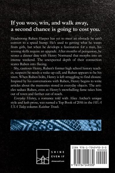 If you woo, win, and walk away, a second chance is going to cost you. Headstrong Ruben Harper has yet to meet an obstacle he can't convert to a speed bump. He's used to getting what he wants from girls, but when he develops a fascination for a man, his wooing skills require an upgrade. After months of persuasion, he scores a dinner date with Henry Normand that morphs into an intense weekend. The unexpected depth of their connection scares Ruben into fleeing. Shy, cautious Henry, Ruben's former high school history teacher, suspects he needs a wake-up call, and Ruben appears to be his siren. When Ruben bolts, Henry is left struggling to find closure. Inspired by his conversations with Ruben, Henry begins to write articles about the memories stored in everyday objects. The articles seduce Ruben, even as Henry's snowballing fame takes him out of town and farther out of reach. Everyday History, a romance told with Alice Archer's unique style and lush prose, was named a Top Book of 2016 in the HEA USA Today column Rainbow Trends. Standalone romance novel. HEA.