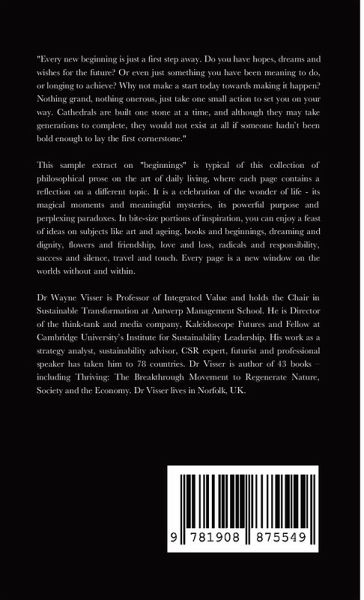 "Every new beginning is just a first step away. Do you have hopes, dreams and wishes for the future? Or even just something you have been meaning to do, or longing to achieve? Why not make a start today towards making it happen? Nothing grand, nothing onerous, just take one small action to set you on your way. Cathedrals are built one stone at a time, and although they may take generations to complete, they would not exist at all if someone hadn't been bold enough to lay the first cornerstone." This sample extract on "beginnings" is typical of this collection of philosophical prose on the art of daily living, where each page contains a reflection on a different topic. It is a celebration of the wonder of life - its magical moments and meaningful mysteries, its powerful purpose and perplexing paradoxes. In bite-size portions of inspiration, you can enjoy a feast of ideas on subjects like art and ageing, books and beginnings, dreaming and dignity, flowers and friendship, love and loss, radicals and responsibility, success and silence, travel and touch. Every page is a new window on the worlds without and within.